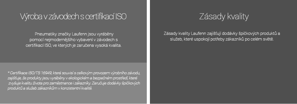 Pneumatiky značky Laufenn jsou vyráběny pomocí nejmodernějšího vybavení v závodech s certifikací ISO, ve kterých je zaručena vysoká kvalita.