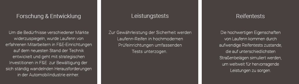 Um die Bedürfnisse verschiedener Märkte widerzuspiegeln, wurde Laufenn von erfahrenen Mitarbeitern in F&E-Einrichtungen auf dem neuesten Stand der Technik entwickelt und geht mit strategischen Investitionen in F&E zur Bewältigung der sich ständig wandelnden Herausforderungen in der Automobilindustrie einher.