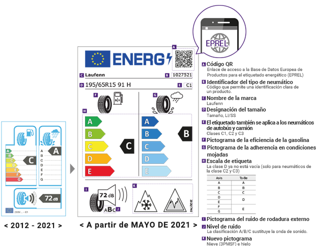 Las normativas exigen que los fabricantes declaren la eficiencia de la gasolina, el índice de adherencia en condiciones mojadas y el nivel de ruido de rodadura externa para los neumáticos C1, C2 y C3, es decir, para los neumáticos que se instalan principalmente en turismos y vehículos de carga ligera y pesada.