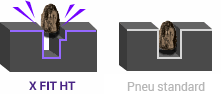 La rainure étagée à l'intérieur du bloc de la bande de roulement du X FIT HT empêche les pierres de se loger dans sa bande de roulement, protégeant ainsi le pneu des dommages extérieurs.