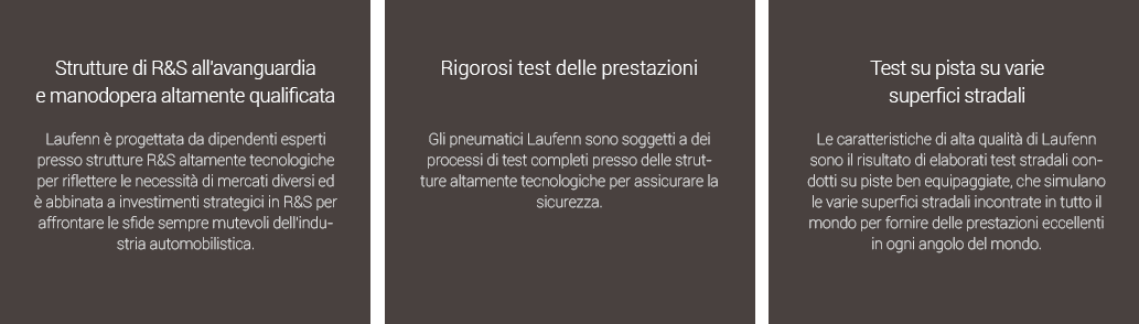 Le caratteristiche di alta qualità di Laufenn sono il risultato di elaborati test stradali condotti su piste ben equipaggiate, che simulano le varie superfici stradali incontrate in tutto il mondo per fornire delle prestazioni eccellenti in ogni angolo del mondo.