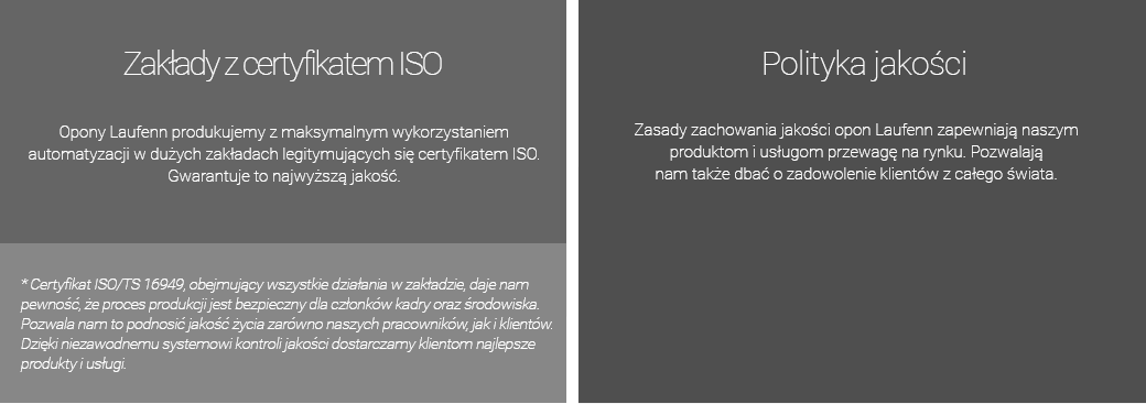 Opony Laufenn produkujemy z maksymalnym wykorzystaniem automatyzacji w dużych zakładach legitymujących się certyfikatem ISO. Gwarantuje to najwyższą jakość.