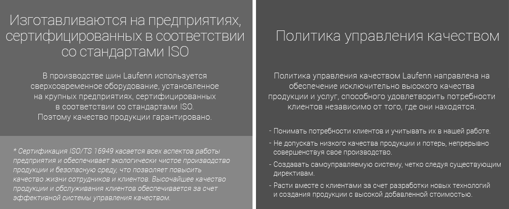 Политика управления качеством Laufenn направлена на обеспечение исключительно высокого качества продукции и услуг, способного удовлетворить потребности клиентов независимо от того, где они находятся.