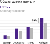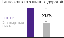 По сравнению с обычными шинами площадь пятна контакта зимней шины I FIT Ice увеличена на целых 20%, что способствует улучшению характеристик торможения на заснеженных и обледенелых дорогах.