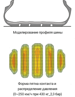Новые технологии, примененные при проектировании профиля и дизайна шины, обеспечивают оптимальную форму и давление в пятне контакта.