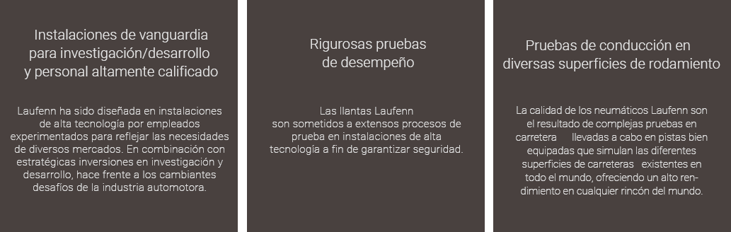 Las características de alta calidad de Laufenn, resultan de las elaboradas pruebas de conducción efectuadas enpistas bien equipadas, que simulan las diversas superficies de rodamiento presentes en todo el mundo, a fin de lograr un máximo rendimiento en cualquier rincón del planeta.