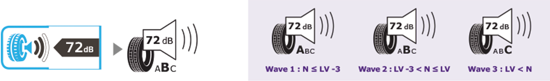 Förutom specifikationen av ljudnivån i decibel (dB) visar symboler om däckets externa rullningsljud överstiger gränsvärdet för europeiska bestämmelser (C = däck med högre ljudnivå), om det ligger upp till 3 dB under det framtida gränsvärdet (B = genomsnittlig ljudnivå) eller om det ligger mer än 3 dB under det framtida gränsvärdet (A = däck med låg ljudnivå).