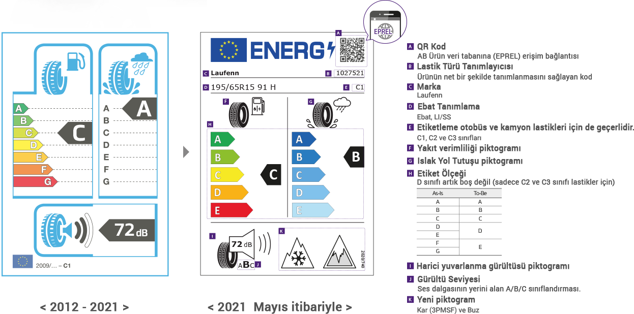 1 Mayıs 2021 tarihinden itibaren geçerli olan 2020/740 sayılı AB Yönetmeliği ile yeni bir logo tasarımı hayata geçirilmiştir. Amaç, halihazırda elde edilen standartların ötesinde, yakıt verimliliği, güvenli ve düşük gürültülü lastiklere doğru bir pazar dönüşümüne öncülük etmek olmuştur.